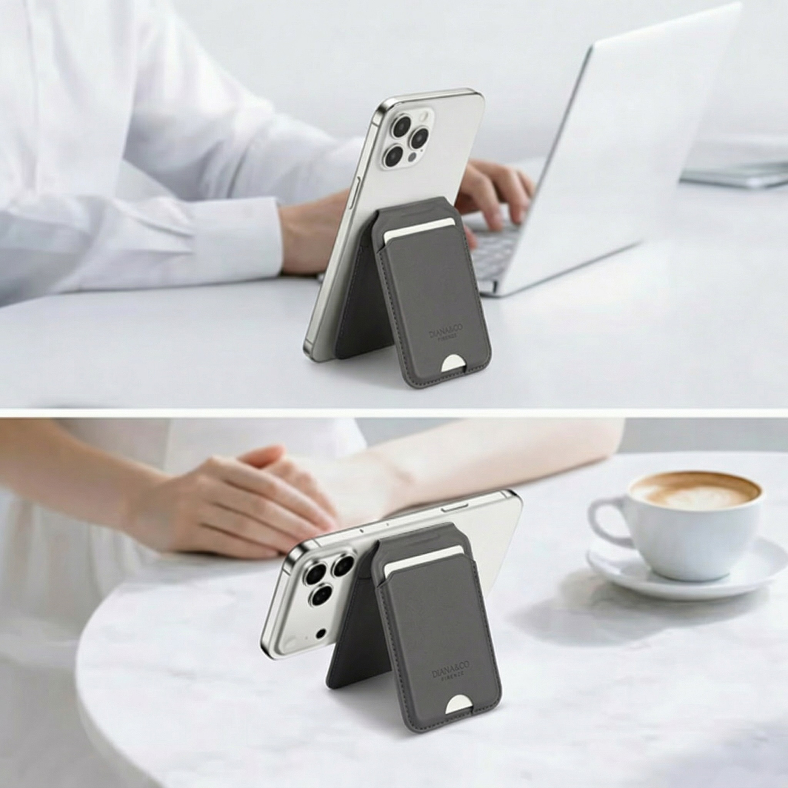 • Suport Ajustabil (Kickstand): Designul pliabil permite transformarea portofelului într-un suport stabil pentru telefon. Acesta poate fi reglat în diverse unghiuri  între 15° și 180°, oferind moduri de vizualizare atat portret, cat și peisaj pentru apeluri video sau vizionarea de continut.